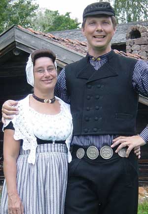 Les hommes portent un costume noir en laine, composé d’un large pantalon à rabat, d’un sarrau à rayures et d’un gilet noir. Une veste noire peut être portée par-dessus, mais elle tient trop chaud pour danser. Malgré l’aspect sobre, le costume des hommes est plus riche que celui des femmes : les boutons de rabat du pantalon sont en argent et ceux du col en or, ce qui autrefois était réservé aux riches.